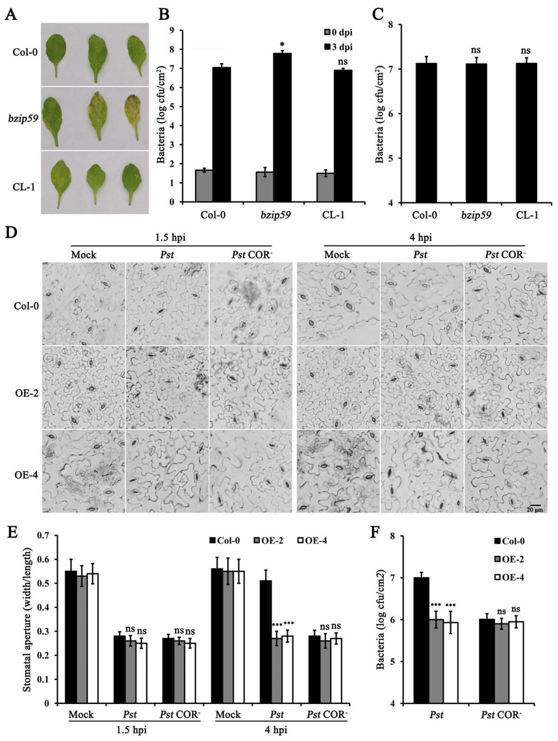 该研究发现转录因子bZIP59在保卫细胞中组成性表达。bzip59突变体在Pst DC3000诱导的气孔关闭中部分受损,在Pst DC3000表面接种时表现感病,而在Pst DC3000注射接种时抗性却不受影响。相反,bZIP59过表达株系在COR诱导的气孔重新开放中受到抑制,并在表面接种时增强对Pst DC3000的抗性(图1)。这些数据表明bZIP59通过调节Pst DC3000诱导的气孔关闭和重新开放参与气孔免疫。