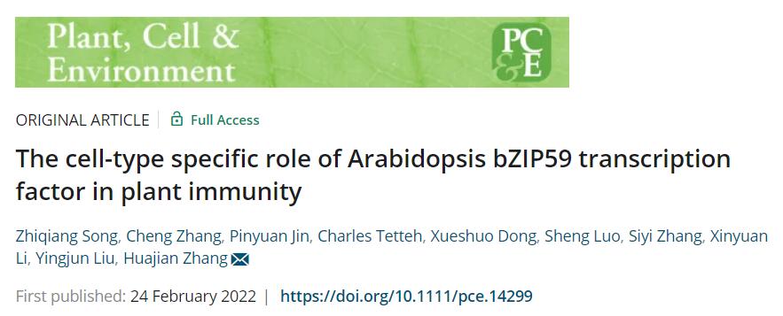 本网讯 2月24日,《植物、细胞与环境》杂志在线发表了我校植物保护学院有害生物综合治理安徽省重点实验室张华建教授团队的研究论文。该研究发现保卫细胞中组成性表达的转录因子bZIP59通过调节气孔关闭和重新开放参与对细菌Pst DC3000的气孔免疫,同时还调控对死体营养型病原核盘菌和活体营养型病原烟草花叶病毒的抗病性,这为植物对抗不同类型病原的细胞型特异性策略提供了新的见解。