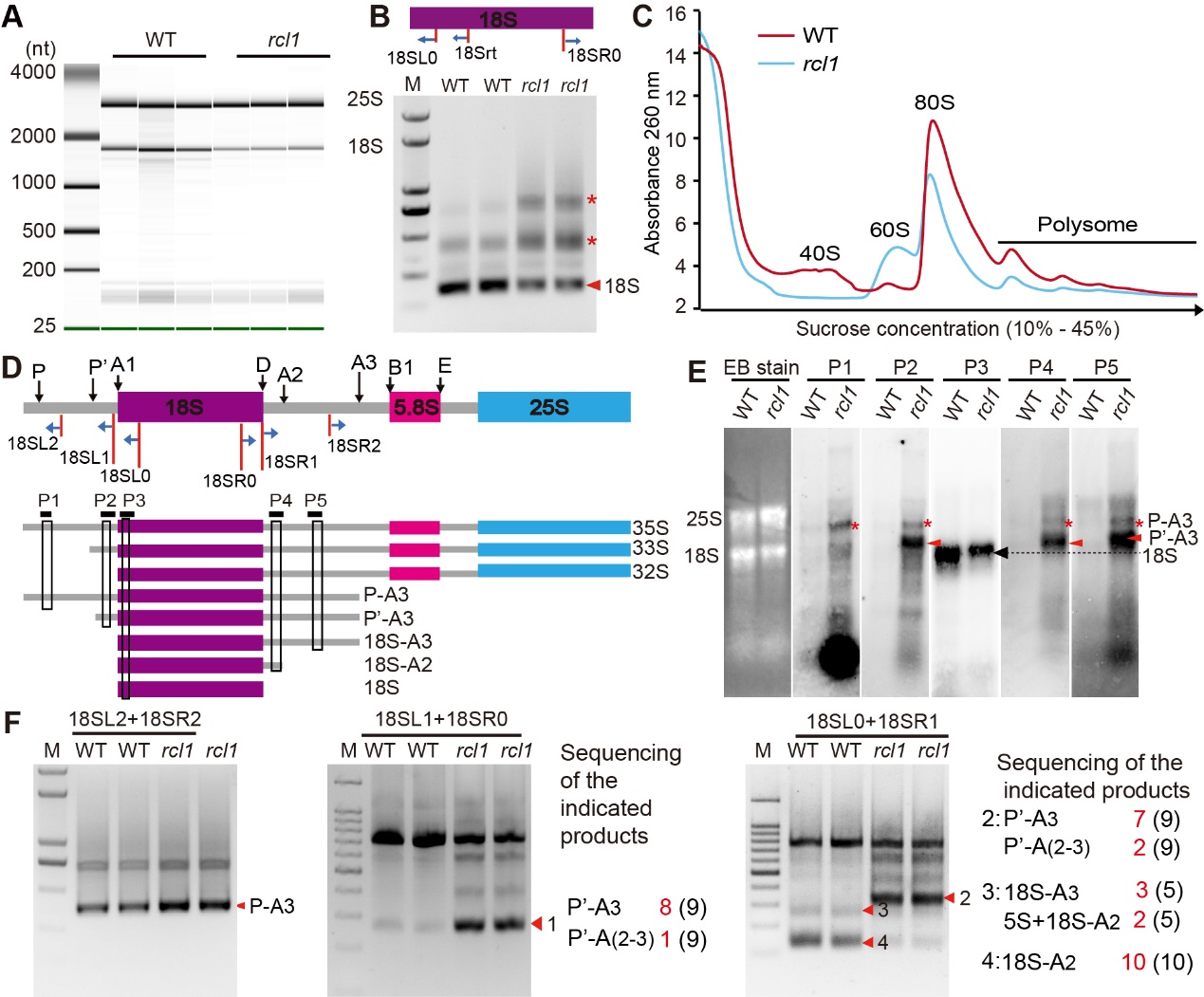 图2 RCL1参与18S pre-rRNA加工过程A:Agilent 2100分析野生型和rcl1突变体总RNAB:核糖体cRT-PCR分析野生型和rcl118S rRNAC:野生型和rcl1籽粒Ribosome profile结果 D:cRT-PCR引物和Northern blot探针检测示意图 E:Northern blot检测18S pre-rRNA加工中间体 F:cRT-PCR分析18S pre-rRNA加工中间体