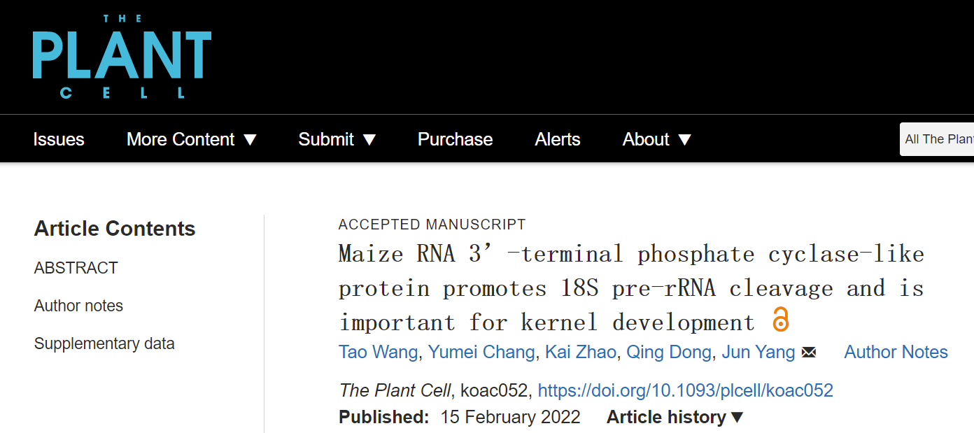 本网讯2月15日,The Plant Cell杂志上在线发表了我校生命科学学院作物抗逆育种与减灾国家地方联合工程实验室杨俊课题组题为“Maize RNA 3’-terminal phosphate cyclase-like protein promotes 18S pre-rRNA cleavage and is important for kernel development”的研究论文(https://doi.org/10.1093/plcell/koac052)。该研究揭示玉米RNA末端环化酶类似蛋白ZmRCL1参与18S核糖体RNA (rRNA)成熟和籽粒发育的分子机制。这是我校首次以第一单位和通讯单位在The Plant Cell上发表研究论文。