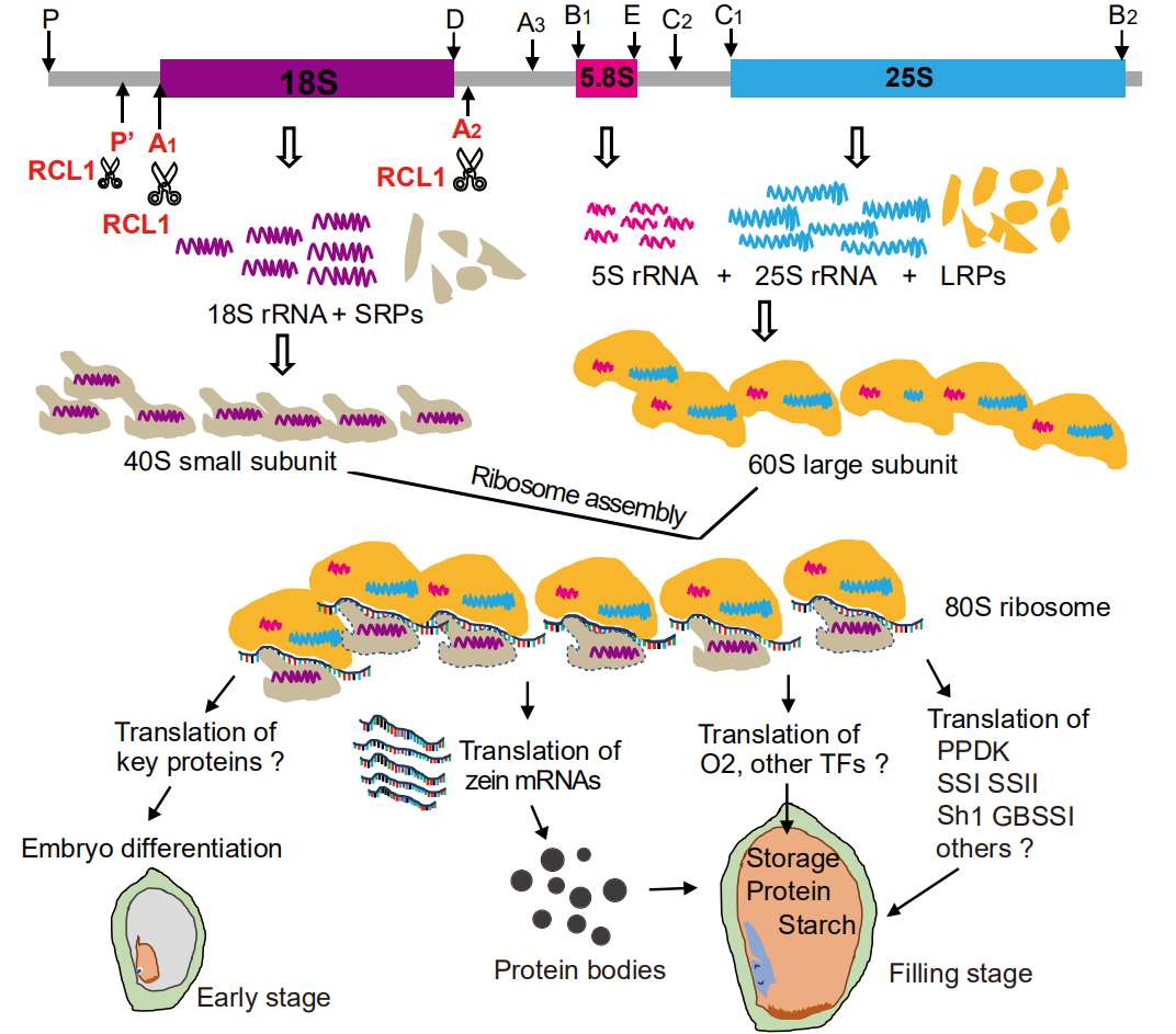 图3 RCL1参与18S pre-rRNA加工,影响核糖体形成,进而影响关键蛋白翻译过程,最后参与籽粒发育和储存物质合成的作用模式图