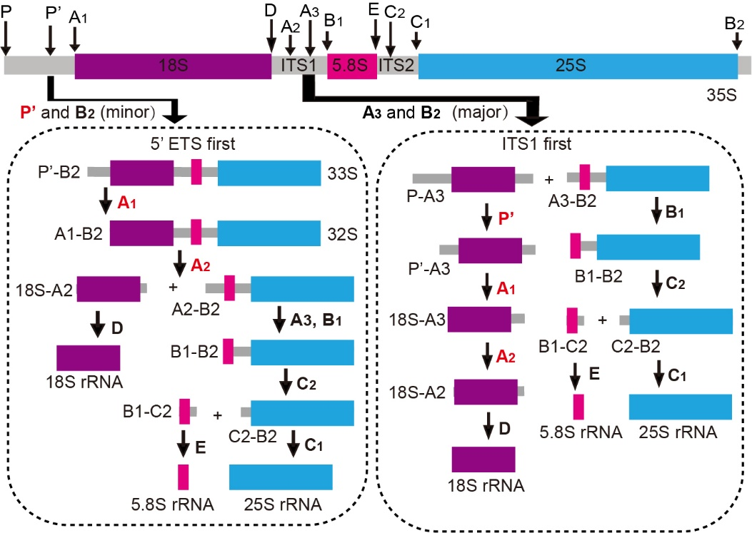 rRNA的加工过程在酵母和拟南芥中研究的比较清楚,rRNA前体(pre-rRNA)上有多个可供核糖核酸内切酶和外切酶作用的位点。pre-rRNA通过不同的加工路径在多个核糖核酸内切酶和外切酶的共同作用下,在多个特定位点,经过一系列的加工形成成熟的rRNA分子。最近,玉米中pre-rRNA加工模式解析发现其路径与酵母有很多相似之处(图1,Liu et al., JEB 2020)。然而,玉米中明确参与pre-rRNA的关键加工因子却鲜有报道。