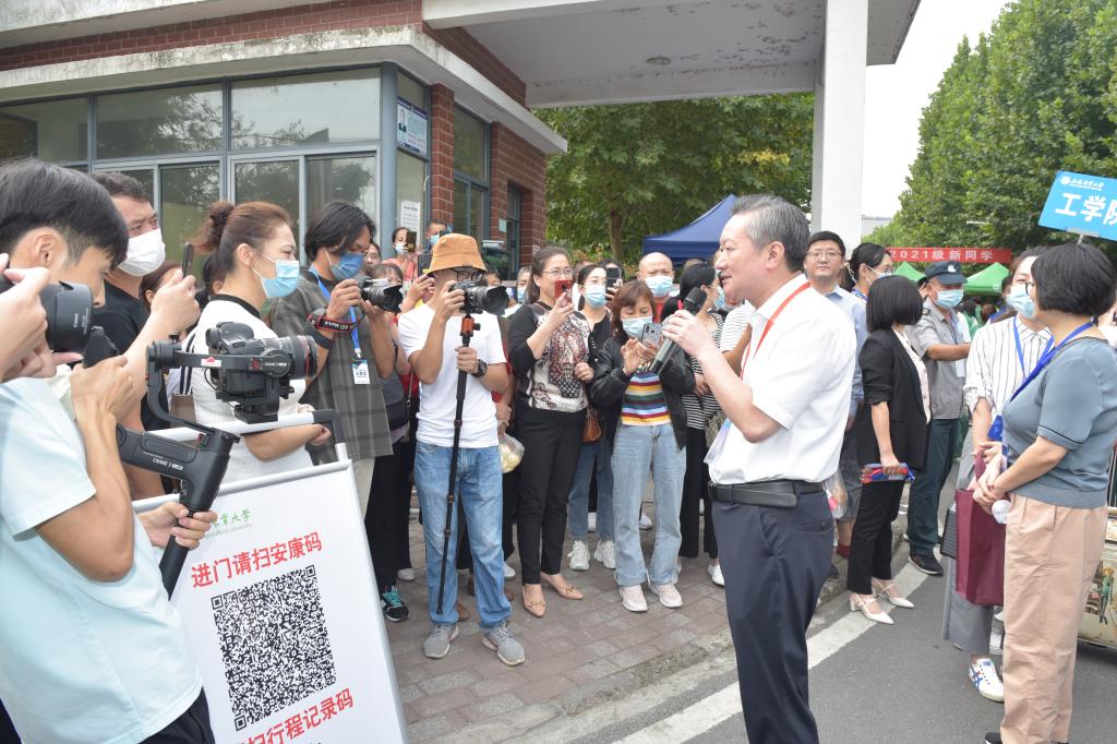 由于疫情防控要求,今年新生入校报到时,家长不能陪同进校,校领导专程到校门外,和广大学生家长见面,感谢他们对学校的信任、理解和支持,表示学校将尽心尽力做好新生入校后的各项保障工作,让同学们在学校学的安心、吃的开心、住的舒心,健康快乐地学本领、长知识。