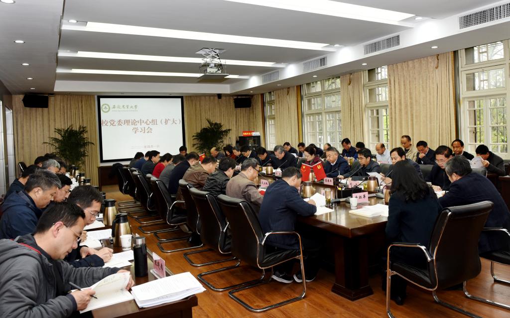 本网讯 4月1日,学校召开党委中心组(扩大)学习会,校党委书记江春主持会议。校领导李红、韩军、陈文兵出席会议。校党委中心组成员,机关各部门、校直各单位主要负责人,各学院党政主要负责人参加会议。