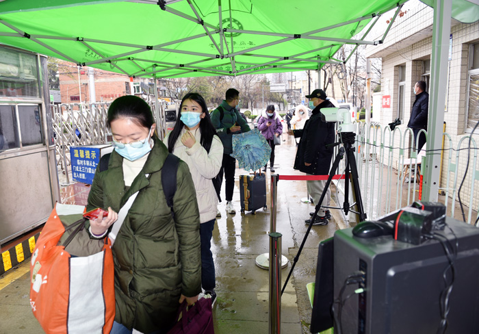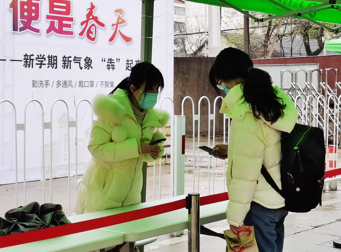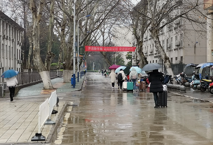 3月1日,我校第一批2017级本科生顺利返校。在工作人员的引导下,返校学生通过健康监测、身份核验等有序进入校园。