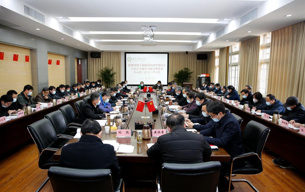 本网讯 1月20日上午,校党委中心组(扩大)学习会围绕校领导班子和成员2020年度民主生活会开展专题学习研讨,校党委书记江春主持会议。校领导夏涛、裴树东、李红、马传喜、韩军、陈文兵、操海群出席会议,校党委中心组成员,机关各部门、校直各单位主要负责人,各学院党政主要负责人参加会议。