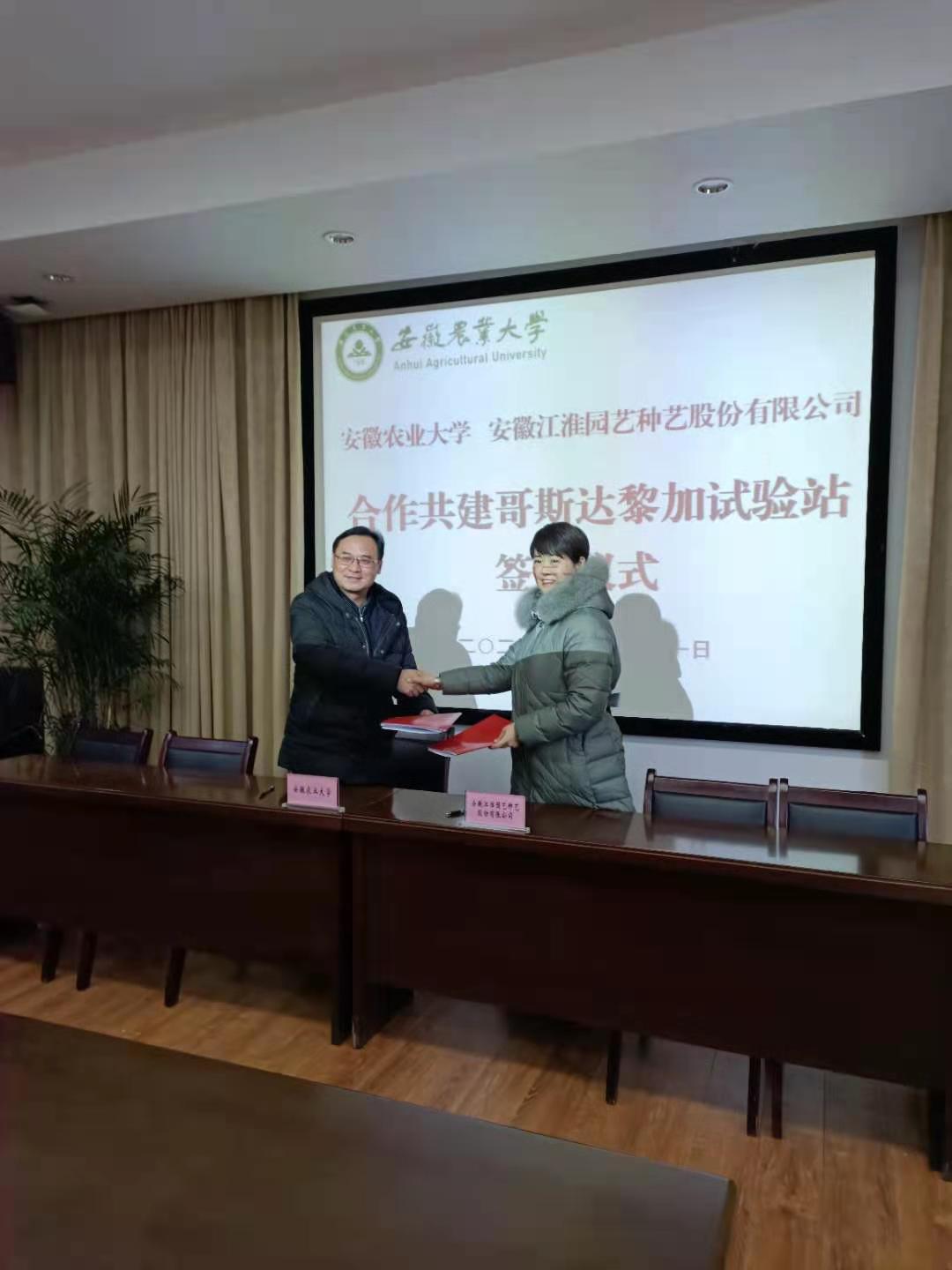 本网讯 12月31日,我校与安徽江淮园艺种业股份有限公司共建哥斯达黎加试验站签约仪式在校第三会议室举行。校党委常委、副校长操海群、江淮园艺总经理王雯雯代表校企双方签署共建协议。签约仪式由操海群主持。