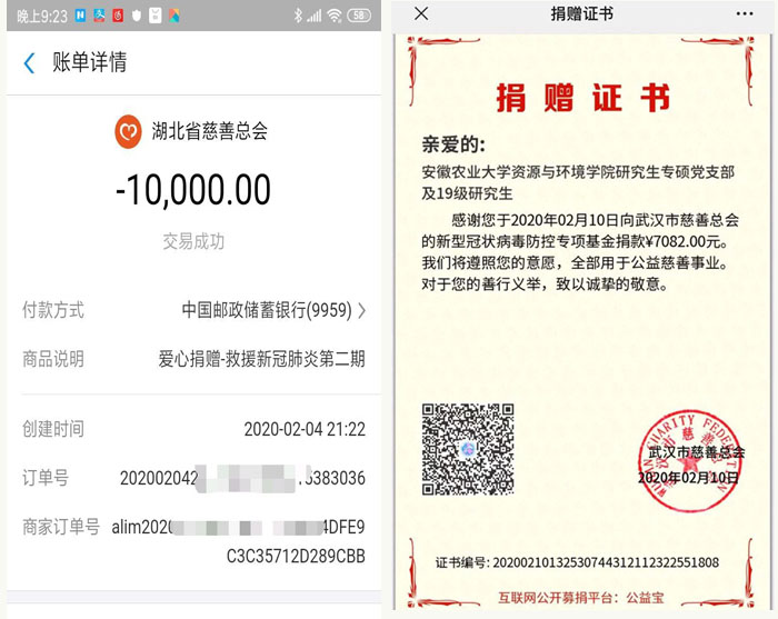 “隔离疫情,不隔离爱。奉献爱的力量,点亮光的希望……”疫情牵挂着全国人民的心。作为我校大学生自主创业平台的公益性组织大益爱心茶室,把用于茶室新一年建设维护的部分资金一万元捐赠给了湖北省慈善总会,希望尽最大努力和全国人民一起为武汉加油,为抵抗疫情贡献力量。与此同时,资源与环境学院研究生专硕党支部、轻纺工程与艺术学院2019级设计学类专业部分同学,都自发行动起来,在能力范围内纷纷为武汉组织捐款。