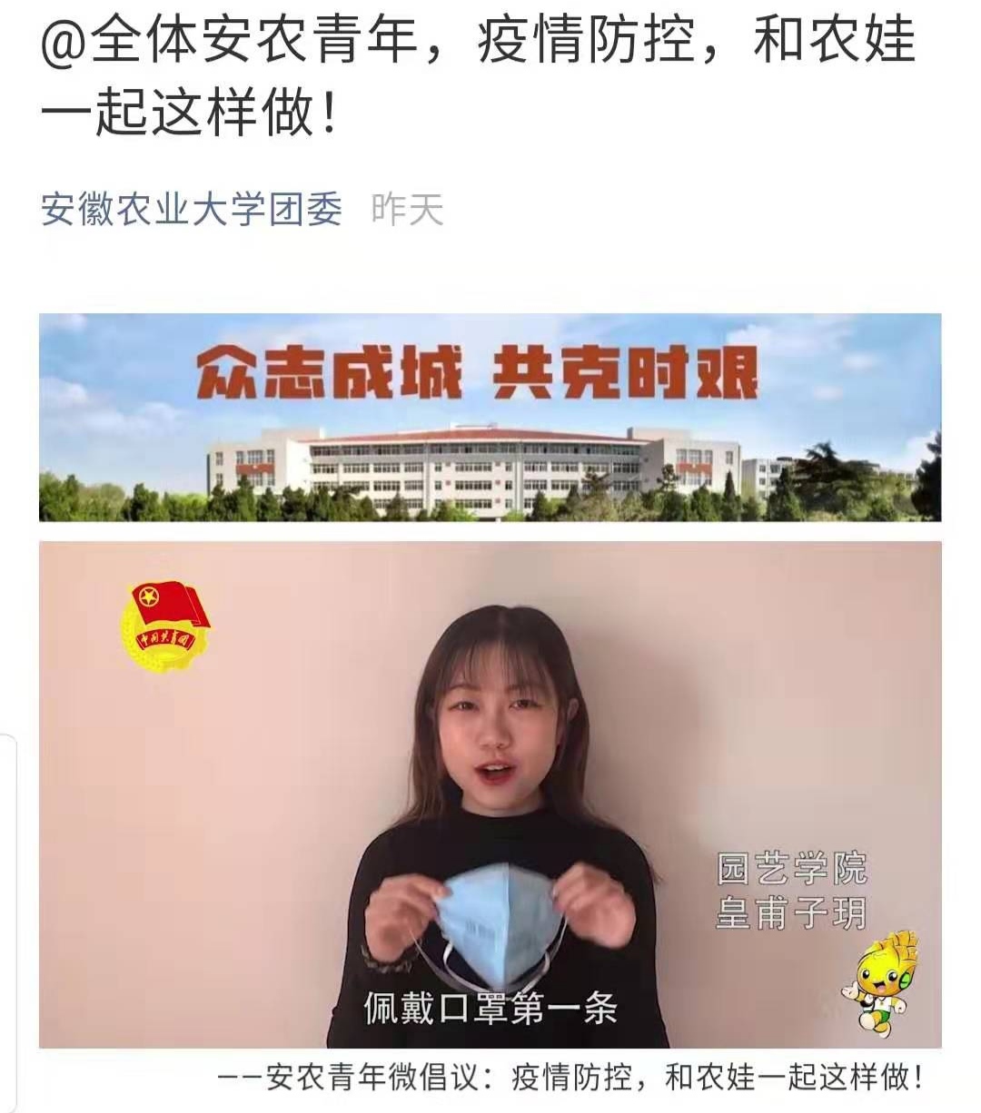 疫情爆发初期,我校共青团即刻微信推文《“年”因有你,更加温暖》,致敬以钟南山院士为代表的逆行者与坚守者。随后,陆续编发以《新冠肺炎防控贴士,我们至少可以做到这九点》为代表的多篇推文,宣传普及防护知识,倡导广大安农青年科学防疫。并通过微信、QQ群、微信群、微博、网站等线上途径,积极宣传《教育部致全国大学生的一封信》《共青团中央关于坚持党的领导,全团动员,在防控疫情阻击战中充分发挥共青团生力军和突击队作用的通知》《关于加强我校新型冠状病毒感染的肺炎疫情防范工作的通知》等,将上级和学校党委关于疫情防控工作的有关精神及时传递给每一位安农青年学子。同时,编发《@全体安农青年:行动起来!我们承诺,我们践行!》《@全体安农青年,疫情防控,和农娃一起这样做!》《致全校同学的倡议书》等,进一步坚定了广大安农青年抗击疫情的信心、掀起了行动起来的热潮。此外,各学院青年学子还纷纷通过自拍视频、制作海报等多种形式传递温情正能量,为武汉加油、为中国鼓劲。