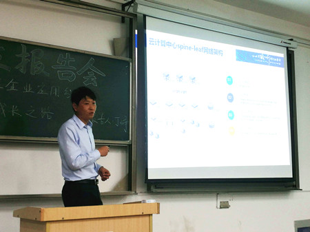 本网讯 5月9日晚,信息与计算机学院2012届网络工程专业毕业生、现任科大讯飞股份有限公司IT架构部经理丁峥校友应学院网络工程系邀请,在经济楼302教室为学弟学妹们带来一场以“网络技术在企业应用分享——网络架构师成长之路”为主题的校友报告会。报告会由网络工程系主任朱军老师主持,学院15级、16级网络工程和计算机等专业同学参加了报告会。