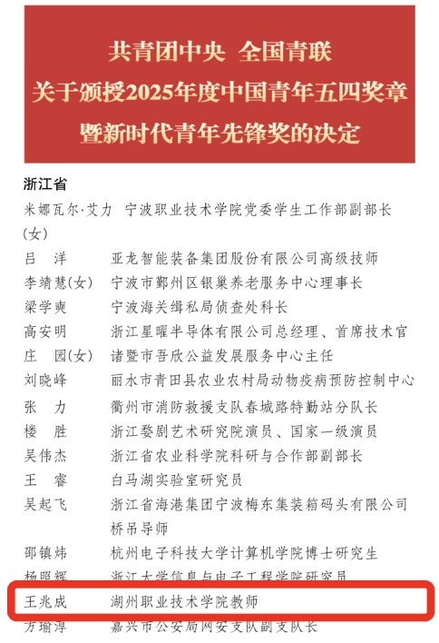 本网讯 近日,共青团中央、全国青联公布了《关于颁授2025年度中国青年五四奖章暨新时代青年先锋奖的决定》,我校林学与园林学院2021届博士毕业生、林业工程在站博士后王兆成荣获“2025年度新时代青年先锋奖”。该奖项是共青团中央、全国青联授予中国优秀青年的最高荣誉,旨在树立政治进步、品德高尚、贡献突出的优秀青年典型,集中反映当代青年的精神品格和价值追求。