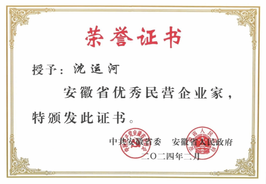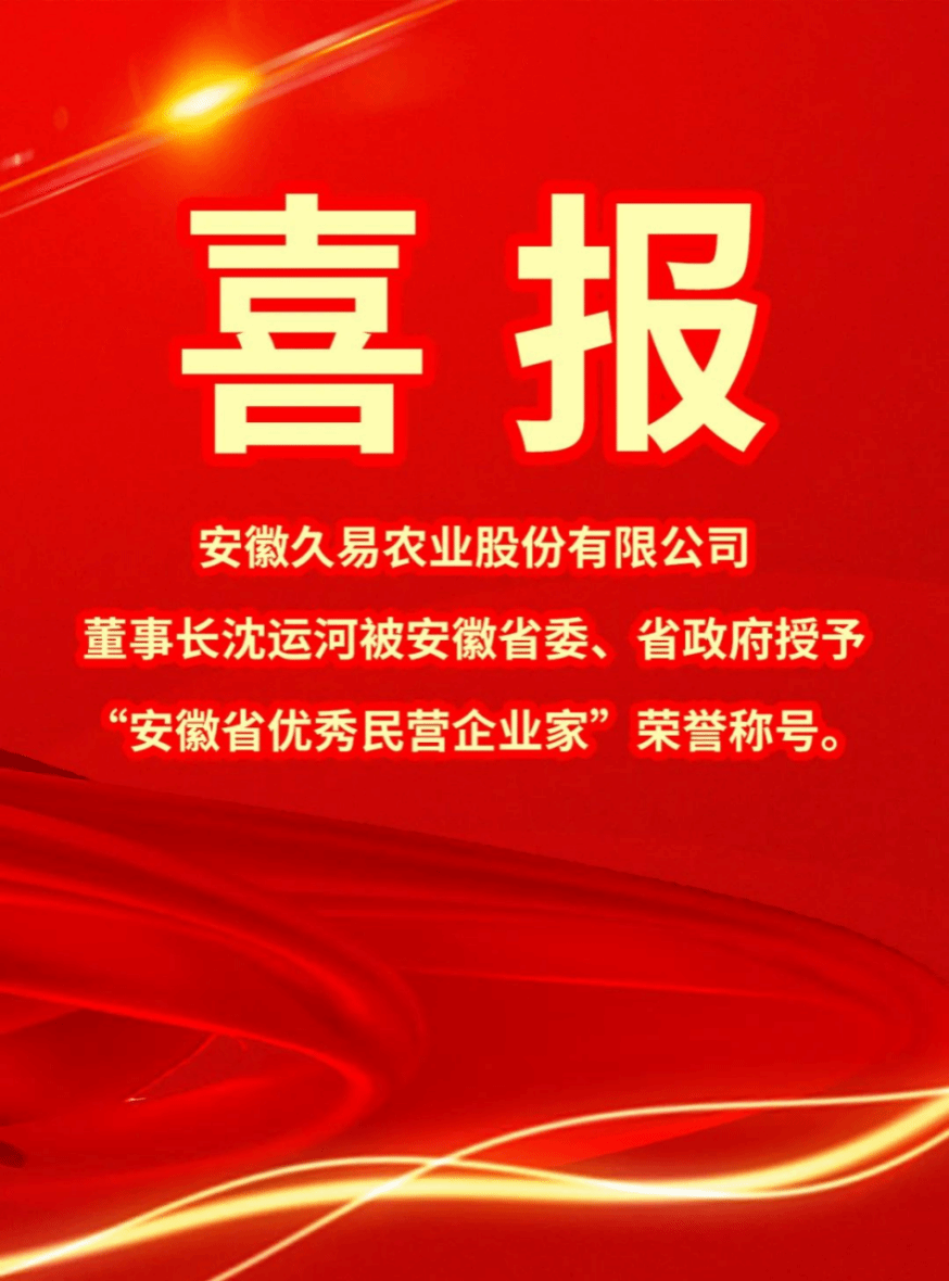 此次荣获“安徽省优秀民营企业家”称号,是安徽省委、省政府对久易股份及沈运河董事长的高度褒奖,体现了久易股份在省、市、县各项政策的支持下,在创先争优精神的指引下,所表现出来的无限发展活力和动力,促使久易股份更加明确了自身的责任与使命。