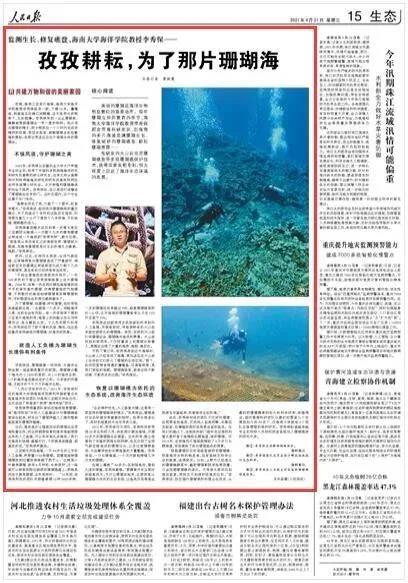 4月21日,人民日报刊发报道《监测生长、修复礁盘,我校03届水产养殖专业校友、海南大学海洋学院教授李秀保——孜孜耕耘,为了那片珊瑚海》,版面图及全文如下: