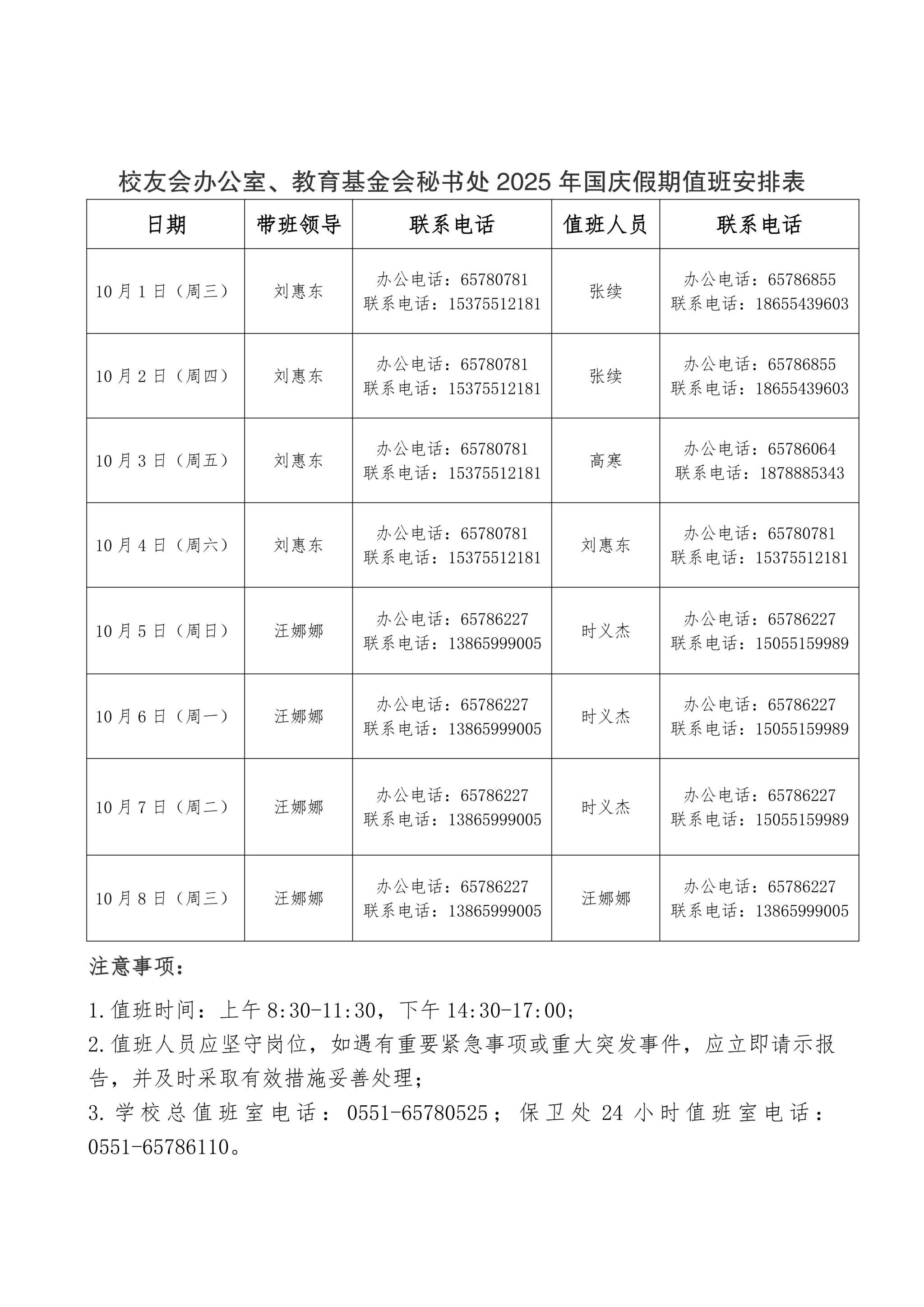 校友会办公室、教育基金会秘书处2025年国庆假期值班安排表