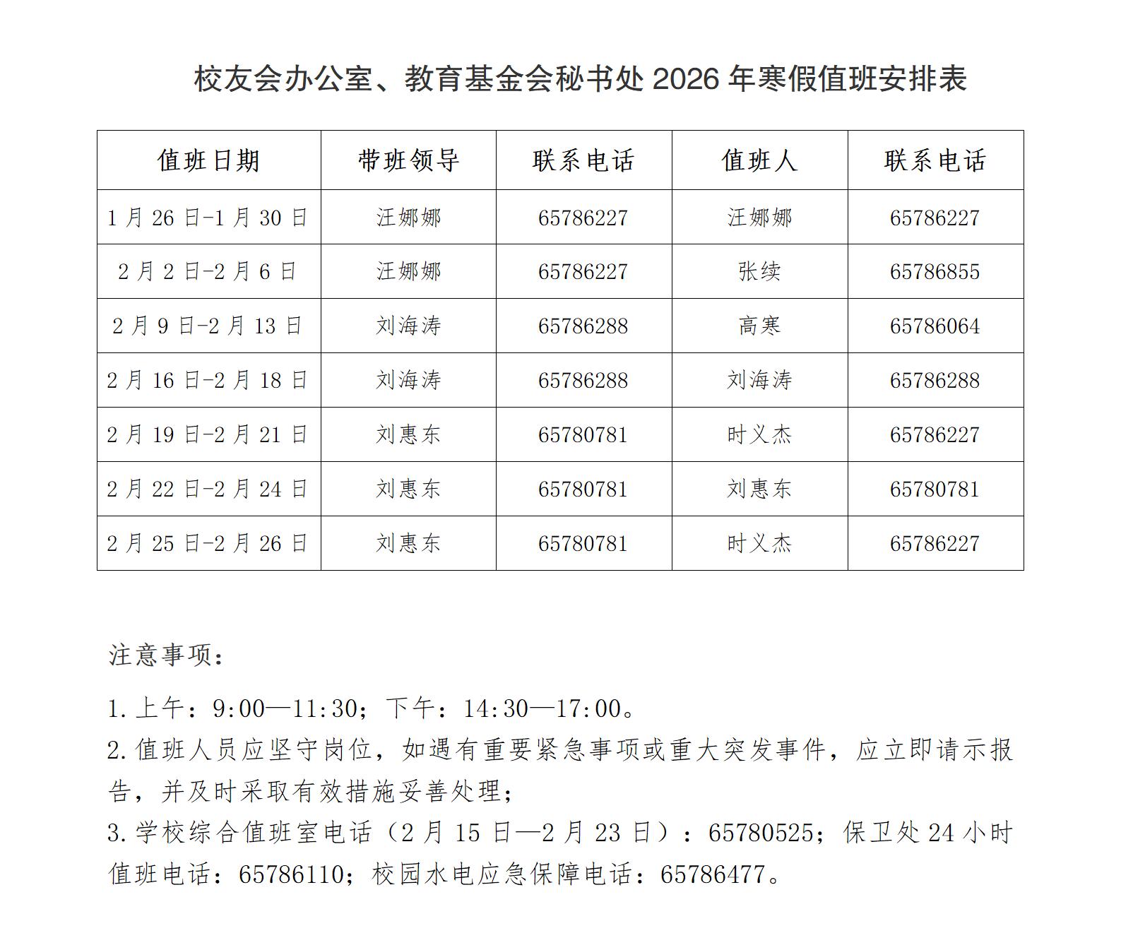 校友会办公室、教育基金会秘书处2026年寒假值班安排表