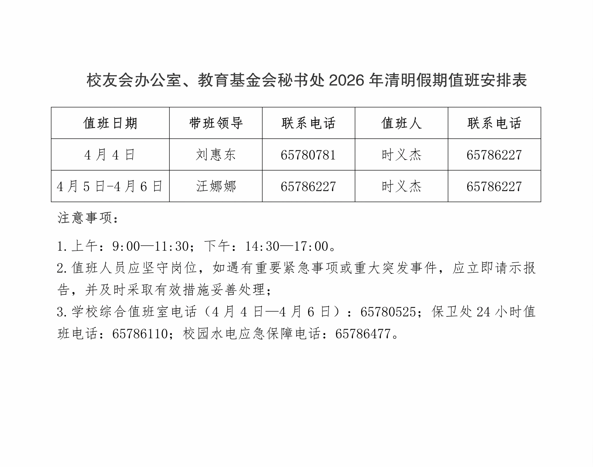 校友会办公室、教育基金会秘书处2026年清明假期值班安排表